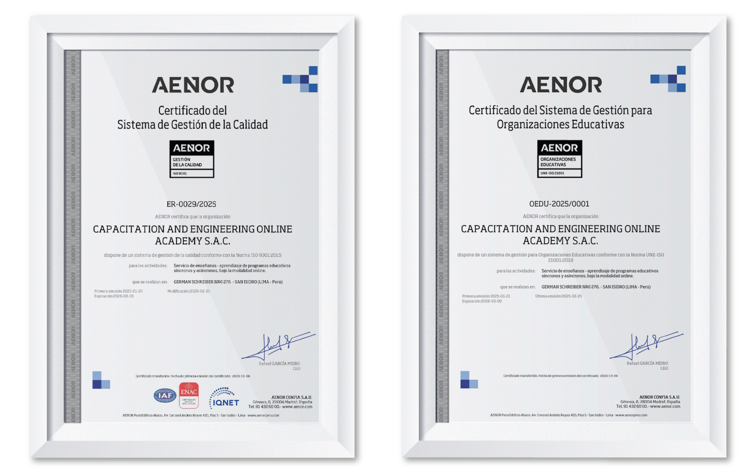 CEO Academy cuenta con un reconocimiento internacional que respalda la calidad de todos nuestros programas. Somos el primer centro de especialización en el Perú en obtener la Certificación Internacional ISO 21001:2018, además de la ISO 9001:2015, ambas otorgadas por AENOR, entidad líder mundial en certificación. Este logro ratifica nuestro compromiso con la excelencia educativa, la mejora continua y la gestión académica basada en estándares globales