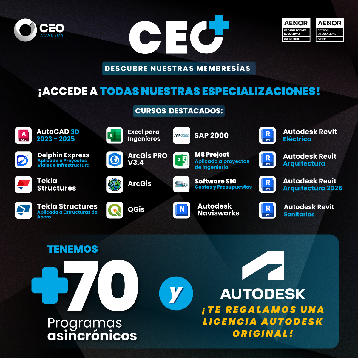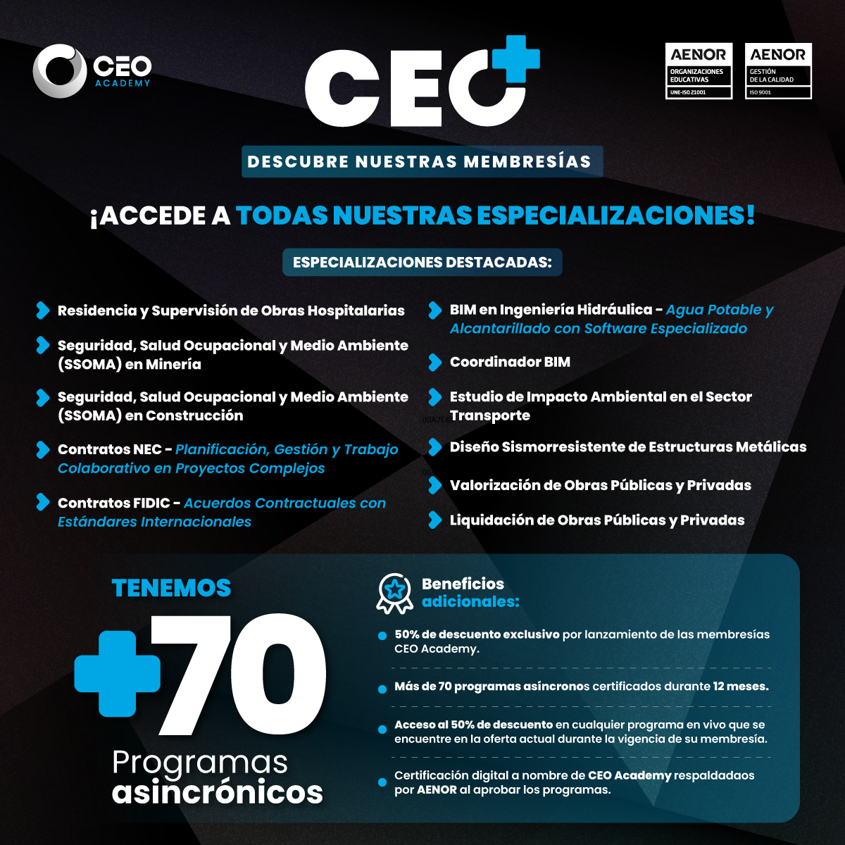 Una membresía de CEO Academy te da acceso a la formación técnica online diseñada específicamente para profesionales de ingeniería, construcción, minería y arquitectura. Cada membresía incluye acceso a contenido asincrónico (cursos o especializaciones) con certificación digital, acceso 24/7 a materiales y evaluaciones, y descuentos exclusivos para programas en vivo durante la vigencia de la membresía.