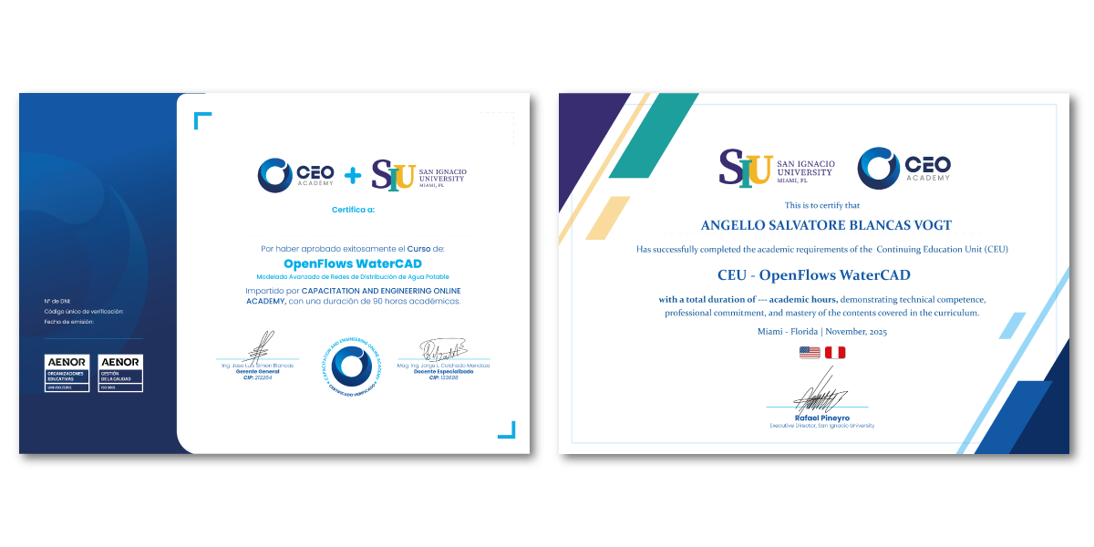 A nombre de CAPACITATION AND ENGINEERING ONLINE ACADEMY con 60 horas académicas, respaldada por las certificaciones internacionales ISO 21001:2018 e ISO9001:2015. Cuenta con un código único especial de caracteres y un código QR para realizar verificaciones en nuestra plataforma virtual y evitar falsificaciones. En el anverso de nuestro certificado se encontrará el temario completo con las notas adquiridas durante el proceso.