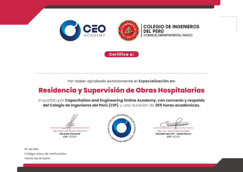 Certificación CIP (opcional): gracias al convenio con el Colegio de Ingenieros del Perú (CIP), el participante puede solicitar una constancia/certificación adicional de manera opcional, sujeta a validación y condiciones del convenio.