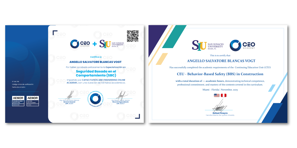 A nombre de CAPACITATION AND ENGINEERING ONLINE ACADEMY con 140 horas académicas, respaldada por las certificaciones internacionales ISO 21001:2018 e ISO9001:2015. Cuenta con un código único especial de caracteres y un código QR para realizar verificaciones en nuestra plataforma virtual y evitar falsificaciones. En el anverso de nuestro certificado se encontrará el temario completo con las notas adquiridas durante el proceso.
