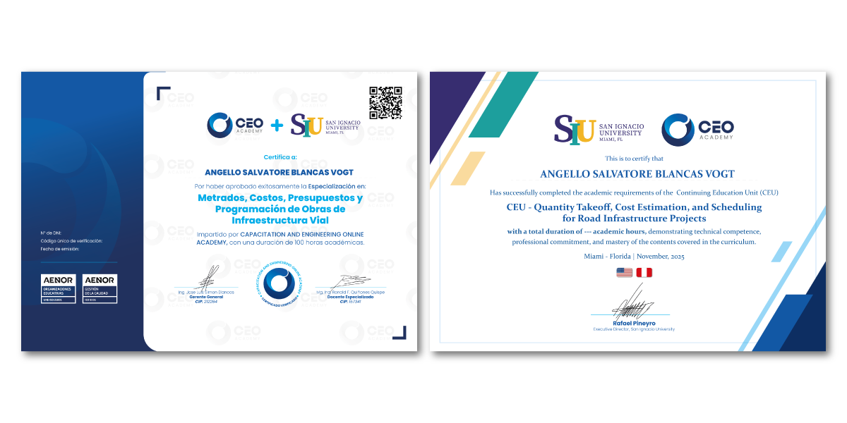A nombre de CAPACITATION AND ENGINEERING ONLINE ACADEMY con 100 horas académicas, respaldada por las certificaciones internacionales ISO 21001:2018 e ISO9001:2015. Cuenta con un código único especial de caracteres y un código QR para realizar verificaciones en nuestra plataforma virtual y evitar falsificaciones. En el anverso de nuestro certificado se encontrará el temario completo con las notas adquiridas durante el proceso.
